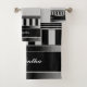 A cute bath towel set featuring a simple geometric pattern consisting of black, gray and silver vertical and horizontal stripes. Monogrammed with an initial and script name for your personalization. Customize it with your details.