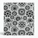 This bold, eye-catching pattern features a ayer of stylized daisy flowers and sunbursts in different shapes. The black design sits on a white background, creating a powerful graphic look. This is a vintage, retro 70's style, perfect for a modern, chic statement.