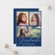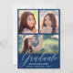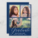 Send your family and friends a unique personalized photo collage graduation announcement card to wow them. This simple template design features three photos for you to change to your own framed in blue. Below your photos is the word "Graduate" in modern white handwritten script typography and your name with your school and year to personalize. The back of the card is blue. Designed by Susan Coffey.
