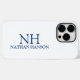 Modern phone case featuring a simple and minimal blue and white design with your monogram in a bold font along with your name.