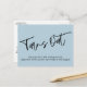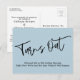If you prefer simple and casual, this could be the announcement card for you. The front features a graphic header I designed using a modern, casual handwriting font, that reads "Turns Out". Lower, there is a cheerful message you can edit, with a conversational tone. It declares your news: "Although We're Still Getting Married, Right Now We're Just Not Sure When It Will Happen." Use the template fields to add your personal details and change any of my draft wording to suit your needs and situation. The type is black on a subtle light blue and you can change the background to any color you prefer.