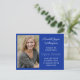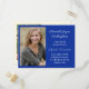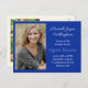 Simple photo graduation announcement in blue with white text. Customize this postcard with two photos of the grad. On the front add a vertical, recent photo. On the back, add a childhood picture. Unisex design, with script for a full name at the top. Class and school name, and open house information. Each postcard can be addressed before purchase by using the mailing address template. Customize one at a time, and add to your cart. Click on the item from the cart and go back to add the next address.