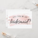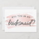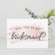 Minimalist brush stroke bridesmaid proposal card. Design features of blush pink brush stroke in faux foil texture on a white background and will you be my bridesmaid in modern font.
