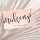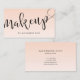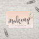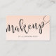 Elegant minimalist makeup business card design which features your name and makeup text in a modern handwritten script lettering, gradient blush pink background and a contact information on the reverse side.