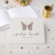 This contemporary wedding design features a minimalist composition, a simple butterfly drawing, and beautiful script typography in burgundy and gray.