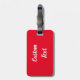 This bright red luggage tag has text in a white script. The text can be edited or deleted.