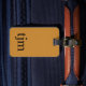 Simple elegant customizable luggage tag design with bronze background, black bold monogram.