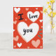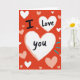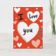 This greeting card features a deep red background covered with many hearts in white and soft pink, scattered all around like confetti. Two larger white hearts stand out, with soft brushy edges that make them feel warm and human. The message reads “I Love you,” with “I” placed by itself in the upper left, “Love” written inside the top heart, and “you” inside the bigger heart near the bottom. The letters look casual and hand-drawn in white, easy to read against the red. In the lower-right heart, a few short teal-blue dash marks shoot outward, like little sparks or a heartbeat. The whole scene feels sweet and honest, like someone is saying what they mean without overthinking it 🥰. It’s a meaningful card to give when you want a simple reminder that you care, whether it’s romance or close friendship ❤️. Hope it helps you share your Valentine’s Day feelings in a kind, heartfelt way.