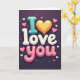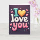 This greeting card shows the words “I Love You” stacked tall in the center, with big rounded letters that look shiny and slightly 3D. The “I” is teal, and a golden heart stands in for the “O” in “Love,” so the message feels instantly romantic ❤️. “Love” is written in white, while “you” is in soft pink with puffy, bubble-like letters and a gentle gloss. Everything sits on a deep charcoal background that makes the colors stand out and feel cozy and intimate. Small hearts in pink and white, plus a tiny touch of teal, float around the main message along with little confetti-like dots. The text looks smooth and friendly, more like balloon letters than a sharp letter style, and it’s placed right in the middle so it’s the first thing you see. It’s a simple way to say something big, whether you’re giving it to a partner or someone you care about 🥰. Hope it helps you share your Valentine’s Day feelings in a sweet, honest way.