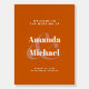 Welcome your wedding guests with a tasteful sign designed with modern minimalist styling. It features the bride and groom's names in bold text with a stylish ampersand joining the names. The color scheme is trendy burnt orange with ecru beige text. This contemporary text is paired with simple lettering with lovely results. Personalize the text with your names, wedding date and city.