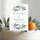 A simply elegant green calligraphy script with two watercolor eucalyptus leaves on either side to decorate this beautiful, minimalist fall wedding cake topper for a bridal brunch or couples shower. Chic autumn wedding decor for a garden occasion.