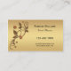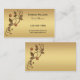 An elegant business card featuring rose gold metallic swirls with stylized leaves and flowers on a muted gold background.