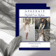 Simple, classy and elegant three photo dark royal blue, white and gray with blue text graduation announcement design featuring script "signature" text for your grad's name.