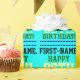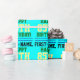 This plain birthday wrapping paper design features a message like "First-Name, happy 85th birthday!", where the name and birthday number can be customized. It also features decorative oval shapes. The background is colored cyan. Wrapping paper like this could perhaps be used to wrap presents being given to celebrate somebody’s birthday. [~Z0000243]