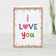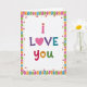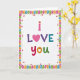 This greeting card centers on the words “I LOVE you” in big, uneven letters that feel friendly and real. The “I” is pink, the “L” is deep purple, “VE” is teal, and “you” mixes fuchsia for the “y,” orange for the “o,” and green for the “u.” A rounded pink heart sits under “LOVE,” like a soft underline that makes the message feel extra caring 🥰. Everything sits on a white background, so the message stands out right away. Around the edges, there’s a busy border of repeating shapes—spirals and little panels in green, blue, orange, magenta, and other bright colors. Small red hearts and tiny gold dots are scattered through the border, giving it a happy, affectionate feel ❤️. It’s a simple way to say “I love you” that still feels thoughtful, and it’s easy to give to a partner or a close friend. Hope it helps you share your Valentine’s Day sentiments.