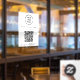 Simple modern white window cling sign for your business with a QR code for customers to scan for a list of your products, services, prices, hours, etc. Add your logo, business name, phone number and street address and input your website URL address to generate a scannable QR code.