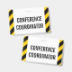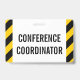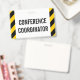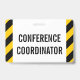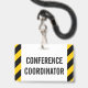This simple badge design features the message "CONFERENCE COORDINATOR". It also features black and yellow colored warning stripes. [~Z0000286]