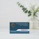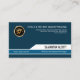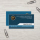 A simple design with the center piece at the base of the card being the main object of attention. Your name rest in a white trapezium. Right below is a light blue rectangle which houses your job title and further down the line, your contact details. All this in a creamy blue background. Directly above you have the business name and its address with its faux gold icon logo beside it.