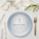 Simple Cross Boy's First Communion paper plate with a dusty blue design. With customizable gray lettering, you add your own text. A lovely addition to your special child's spiritual milestone.