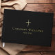 Memorial funeral guestbook featuring a simple Christian cross on a black or custom color background.