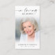 Simple memorial prayer card featuring a cherished photo of your loved one and the sentiment IN LOVING MEMORY in elegant calligraphy script typography on the front and a suggested prayer or your custom text and optional cross on the back. These cards provide guests with a personal reminder of the one who has passed—something beautiful they can carry or keep close.