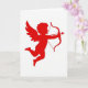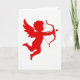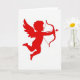 This design shows a red Cupid silhouette flying across a white background, with small wings and curly hair hinted in the shape. Cupid’s legs are bent as if he’s rushing forward, and his body angle makes the scene feel full of motion. He holds a bow pulled tight, with an arrow lined up and aimed at an unseen target. The strong red-on-white contrast keeps your eyes on Cupid right away and makes the message feel direct and heartfelt ❤️. There’s no extra scenery, which gives the card a quiet space where the idea of love can stand on its own. There isn’t any printed text on the front, so the image does all the talking and leaves room for your own words inside 🥰. It feels meaningful to give because it’s a simple reminder that love can be brave, a little daring, and worth reaching for.