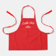 Great color and even though I ordered the kid size, it covers well enough to use during the holidays. I am not a big woman and prefer a shorter apron. I stand 5"6" and the length of the garment goes to mid-thigh. The tie straps fit well at my waist and even though there is no neck strap adjustment, the opening is plenty big enough. I am happy with the size and fit. I am sharing my apron with my 10 year old grandson, too! The color is vibrant and looks good, as shown on the website. The stitching looks strong and reinforced. Photographed is front side and back side of the apron, reinforced straps and coloring. My phone camera may not be the best at showing the details.