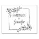 This simple "Handmade" rubber stamp features a flower frame with a custom script name.