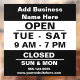 Create a custom office hours sign with your business hours. Office hours sign in your window gives your small business a professional touch. Personalize with your business name and hours and denote the days your company is closed and open.
