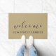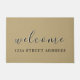 Welcome guests to your home with stylish elegance. This elegant doormat features a stylish welcome message and street address in black modern script on a tan background. Personalize with your custom message, address, family name or established date, or use the "contact this designer" button for help.