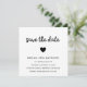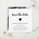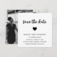 Minimalist save the date card featuring a simple design with the words, "save the date" in a thick handwritten script font and a heart above your event details. The backside has your favorite photo or you can delete the template image to leave it blank by clicking the "customize" button. All design elements are black over a white background. A modern and stylish way to announce the date of your upcoming wedding.