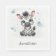 Cute baby shower or birthday paper napkin featuring adorable little male zebra with some blue love hearts