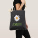 This modern tote bag features a simple white daisy with a yellow center and a personalized name in green text. This minimalist design will make a great gift for family, friends, coworkers, sports teams, and more. Customize the text to fit your needs.