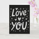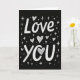 This card features the words “Love You” in white, drawn with a casual, hand-drawn look on a deep black background. “Love” sits above “You” right in the middle, so your eyes land on the message right away. The letters are thick and rounded, with little dashed marks inside them that feel like chalk or marker strokes. The “o” in “You” is replaced by a white heart filled with light cross-hatching, which makes the message feel extra caring ❤️. Around the words, you’ll notice small white hearts, tiny crosses, and dots sprinkled like confetti in the dark space. The simple black-and-white contrast keeps it easy to read and gives it a quiet, cozy feel. It’s a meaningful card to give because it says exactly what you want to say, without needing a long note 🥰. Hope it helps you share your Valentine’s Day feelings in a kind, genuine way.
