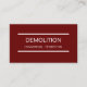 Demolition business cards with simple yet powerful design that displays your profession on the front in black and white with two lines that accentuate and promote your name, and all your contact information on the back. Personalize the text, text layout, and background color if you want to make this your own on this two side business card design. Best business card for a construction service, demolition contractor, or construction equipment leasing.