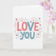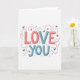 This card features the words “LOVE YOU” centered on a white background, stacked on two lines with “LOVE” above “YOU.” The letters are thick and rounded, with a slightly textured look like they were drawn with a brush or colored pencil. “LOVE” is mostly coral red, while “YOU” is mainly muted teal blue, with the “E” in “LOVE” and the “E” in “YOU” picked out in coral for a sweet little tie-in. Around the words, small hearts—some filled in and some just outlines—float in the same coral and teal colors. There are also dotted lines that curve and zigzag, plus a few tiny shapes, giving the feeling of confetti drifting through the air. The message text sits right in the middle and looks friendly and easy to read, so it feels direct without being too serious. It’s a simple way to say what you mean, whether it’s for a partner or someone you care about a lot 🥰❤️. Hope it helps you share your Valentine’s Day.
