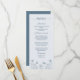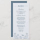 Unique simple wedding menu card featuring romantic and elegant dusty blue flowers on light blue background