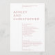 Simple minimalist wedding ceremony program stripped of extraneous ornamentation and prioritizing functionality, balance and harmony. The design highlights the couple’s names as a focal point in a large isolated text block, shifting the margin for the remaining details. Clean minimalist typography. Back of card includes the bridal party and a simple memoriam details in white text on a colored background. Available in a curated selection of rich modern colors. Design is easily customized and personalized. Please reach out with any comments or for assistance to meet your individual need. Always happy to help! Note: Leave any text areas blank to remove or use the design tool for more specific, elaborate customizations.