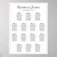 This beautiful wedding seating chart features a timeless classic black and white design that combines elegant simplicity with stylish beauty. The chart has 14 tables with room for 10 seats per table for a total of 140 names, people, or guests. The minimalist design includes the names of the couple written in fancy script calligraphy with the same typography used for the table headers. There is a thin black border around the edge. Wonderful way to add style, class, and grace to your wedding reception while making it easy for your guests to find their tables.