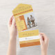 Elegant, modern boho, simple, contemporary pastel yellow and orange wedding all-in-one invitation, with giant monogram initials and two pictures of the couple.