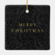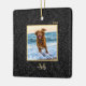 Simple Elegant Custom Pet Name Photo Black Botanical ceramic Christmas ornament with a gold monogram, white script name, and gold year. Merry Christmas in gold serif font on the back.