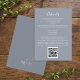 A simple minimalist wedding details enclosure card with white text and a dusty blue color scheme. This template features a QR code, wedding website, and information and response reply vial website. The back features a grey ampersand and bride and groom's monogram initials.