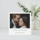 This simply chic custom photo wedding thank you card template features an elegant, minimalist, modern design. Please check our store for a rectangular version of this design in various text colors, too! The front features your first names under your favorite photo and a 'LOVE and THANKS' message conveyed with a striking blend of two distinct fonts, with 'and' in a light, flowing script between the rest of the other two words, which are in upper case with a bold, crisp formal look. The 'LOVE and THANKS' part of the design is in black and can't be altered. When you edit the front to show your own names, you might change the color of that text to gold or something else instead of the default black according to your taste. On the both sides, we've set the background as transparent, so that the color of the paper will simply serve as the base color. You can choose a color for the background on one or both sides if you prefer. The default text color on the back is black, but you can change this if you prefer another color. We've put some sample text on the back for you to replace with your own message as you see fit, but please don't feel restricted by this. If you prefer delete our sample text entirely and keep the back totally blank so that you can write a handwritten note on each card instead, you can do that. Or you might want to replace our text with your own message of gratitude and your own closing and then hand sign your names when you receive the cards. In any case, please do remember to remove all of the sample/placeholder text on both sides as well as our sample photo! We've chosen matte rather than semi-gloss as the default paper choice, as it is well suited to writing your own message on and won't smudge. You can of course change this to semi-gloss, or you might consider upgrading to something with a texture such as zazzle's 'Laid' or 'Felt White', which can add a feeling of warmth and depth. We hope you'll enjoy experimenting with various aspects of this stylish modern wedding thank you card's appearance and make it uniquely yours with the intuitive design tools and your inspiration!