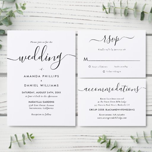 Plain white envelopes are included with paper invitations and will come to fit the invitation size you select. If you don’t need the envelopes, you may choose to not receive them by selecting the dropdown below "Envelopes" and choosing "None." If you’d like to have a design on your envelopes, you can browse all of these available envelopes to find the design that complements your Simple Elegant Modern Script 4 Photo Wedding Invitation.