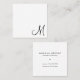 Modern square business card with your single letter monogram in black script at the bottom right corner, over a white background. Use the template to add your name, title, phone number and social media username to the back. This design is great for a makeup artist, hair stylist, event planner, interior designer and more.