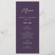 This modern, minimalist fall wedding reception menu card offers a simple clean layout on a dark purple background. The design offers space for you to add your wedding reception menu items along with the names of the bride and groom and their wedding date.