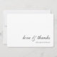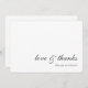 This simply elegant wedding thank you card features 'love and thanks' in an elegant script with your first names beneath it in a very dark gray tone that is mostly black on the front. We've made the 'love and thanks' entirely lower case, but you might choose to capitalize the 'L' and 'T'. And you might decide on a different format for your names, such as 'Mr. and Mrs....' or your first names and last name, etc. On the back, where we've added placeholder text in a different gray tone. You can change the text color to black if you prefer, or any other color that suits your style. The default shape is rounded corners, but standard sharp corners also work well with this design, so check out that look as well and see which you prefer. You might want to enter your own expression of thanks after deleting our placeholder text on the back, or you might prefer to delete our text and leave that blank so that you can later write your message by hand on each card. Similarly, if you do decide to enter your own message, you might choose to add your names as well, or enter just your message without your names so that you can sign your names by hand on each card after you receive them. You can also of course change the color and font of the text. We set the background as transparent to let the color of the paper simply serve as the base tone on both sides. But if you prefer another look, you can choose a color for the base on either or both sides. Use the intuitive editing tools and your inspiration to make this chic wedding thank you card uniquely yours. And please check our store for a selection of other elegant designs!