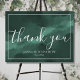 This minimalist 2-sided wedding sign features a green watercolor background with hues ranging from light green to deep emerald green, almost black, complemented by white fonts and a simple white line frame on both the front and back. The front side says "Welcome" and the back side says "Thank You," making it versatile for use during the wedding ceremony or reception. Both sides include the bride and groom's names and the wedding date. The text is presented in a mix of calligraphy script typography and a classic serif font. Exuding simplicity and elegance, this sign integrates seamlessly with any wedding theme, including traditional, classic, or modern. It works well for any season of the year, including spring, summer, autumn, fall, and winter. The chic green watercolor background and white font colors can be customized to fit your specific preferences. Its understated elegance makes it a versatile choice for your special day. Simple Stylish Elegant Green Watercolor Wedding Sign.