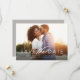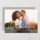 A simple but elegant save the date card to announce your engagement and upcoming wedding. The single horizontal photo features white text at the bottom with plenty of room for names and big day details. The back is a soft gray with a subtle stripe pattern. The color can be changed by clicking "customize further."