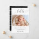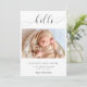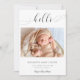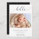 "Hello" in elegant script font with fancy swashes. A simple and elegant photo baby birth announcement. Modern, minimalist, and clean look. The back side has cute polka dots pattern.